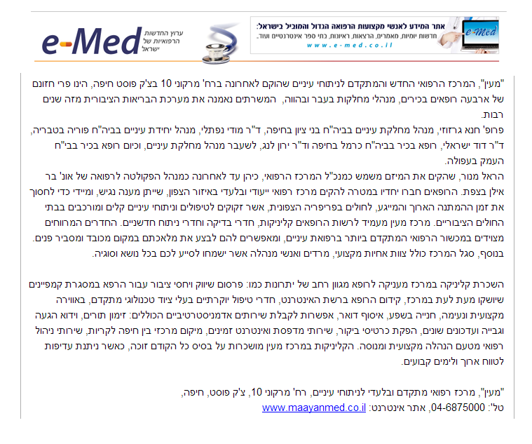 מרכז רפואי מעין - e-Medערוץ החדשות הרפואיות של ישראל