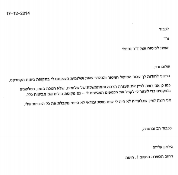 מרכז רפואי מעין - מכתב תודה - שירות טרום ניתוח